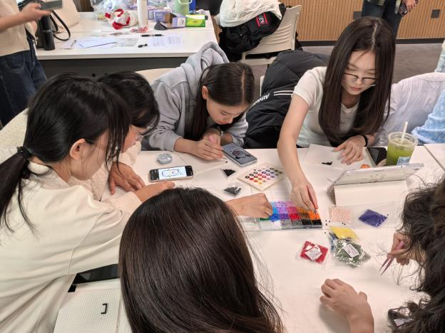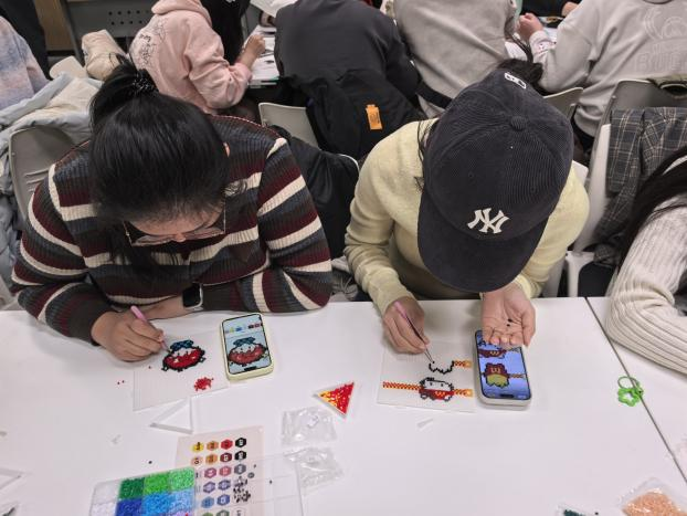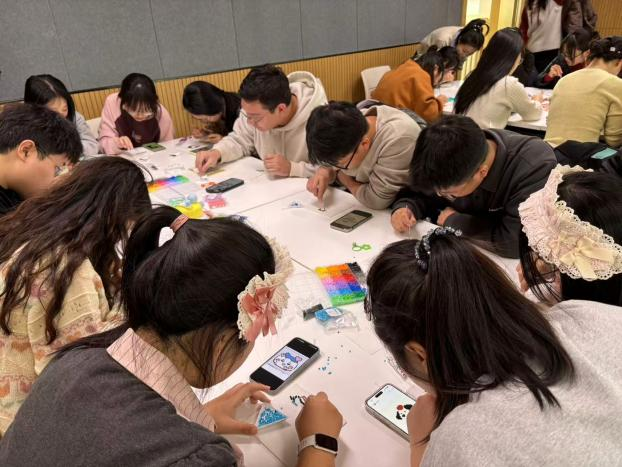 拼豆创作环节,时光仿佛被按下了慢放键,喧嚣渐远,只剩下心灵与指尖的对话。同学们围坐桌前,围绕“我想成为什么”的创作主题,尽情发挥创意,勾勒出专属的心灵图景。有人用热烈的红与橙拼出卡通动漫的热血角色,寄托对勇敢与自由的向往;有人用温润的蓝与白勾勒出线条小狗,象征着对陪伴与联结的珍视;有人用绚丽的粉与紫绘成萌物,诉说着要用行动去表达,而不只是语言,以温柔与友善连接世界。镊子挑过彩豆,一粒粒精准摆放,专注的神情里,学业的压力、生活的烦忧如同被时光过滤,渐渐褪去,只剩下内心的平静与创作的愉悦。