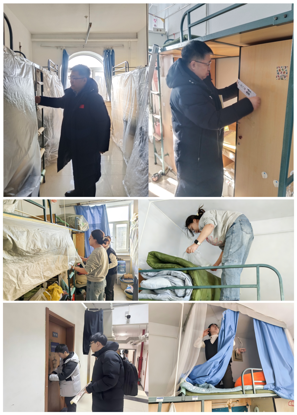本次工作围绕安全排查、公寓清理及施工保障筹备展开。工作人员重点排查各离校公寓的电源电器、门窗等安全隐患,对已离校、无人居住的寝室进行“断电”检查,确保无消防安全隐患;对发现的问题现场督促整改。针对寒假公寓施工可能产生粉尘的情况,学院提前谋划,统一购置防尘塑料膜分发至各寝室,指导学生规范覆盖并拍照备份,确保防尘措施落实到位;同时,明确学生公寓空调及电气系统改造相关工作将严格按工作方案执行;工作人员还与学生深入沟通离校时间、返乡安排及假期计划,切实落实关怀举措。