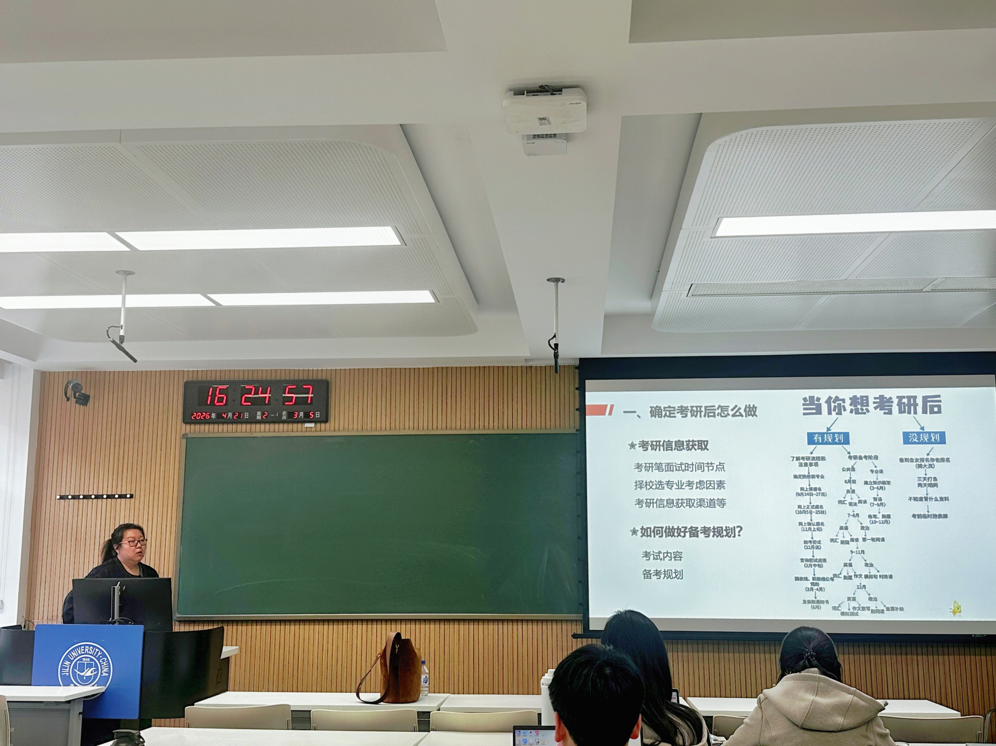 活动尾声,刘静涵老师对本次分享会进行总结,结合自身经验与学院人才培养目标,为同学们答疑解惑、指点迷津。她鼓励同学们要重视考研重要时间节点,脚踏实地推进专业课与公共课学习,认真做好初试、复试准备,争取成功上岸;更要以优秀师生为榜样,坚定理想信念,传承奋斗精神,以实际行动实现青春价值。