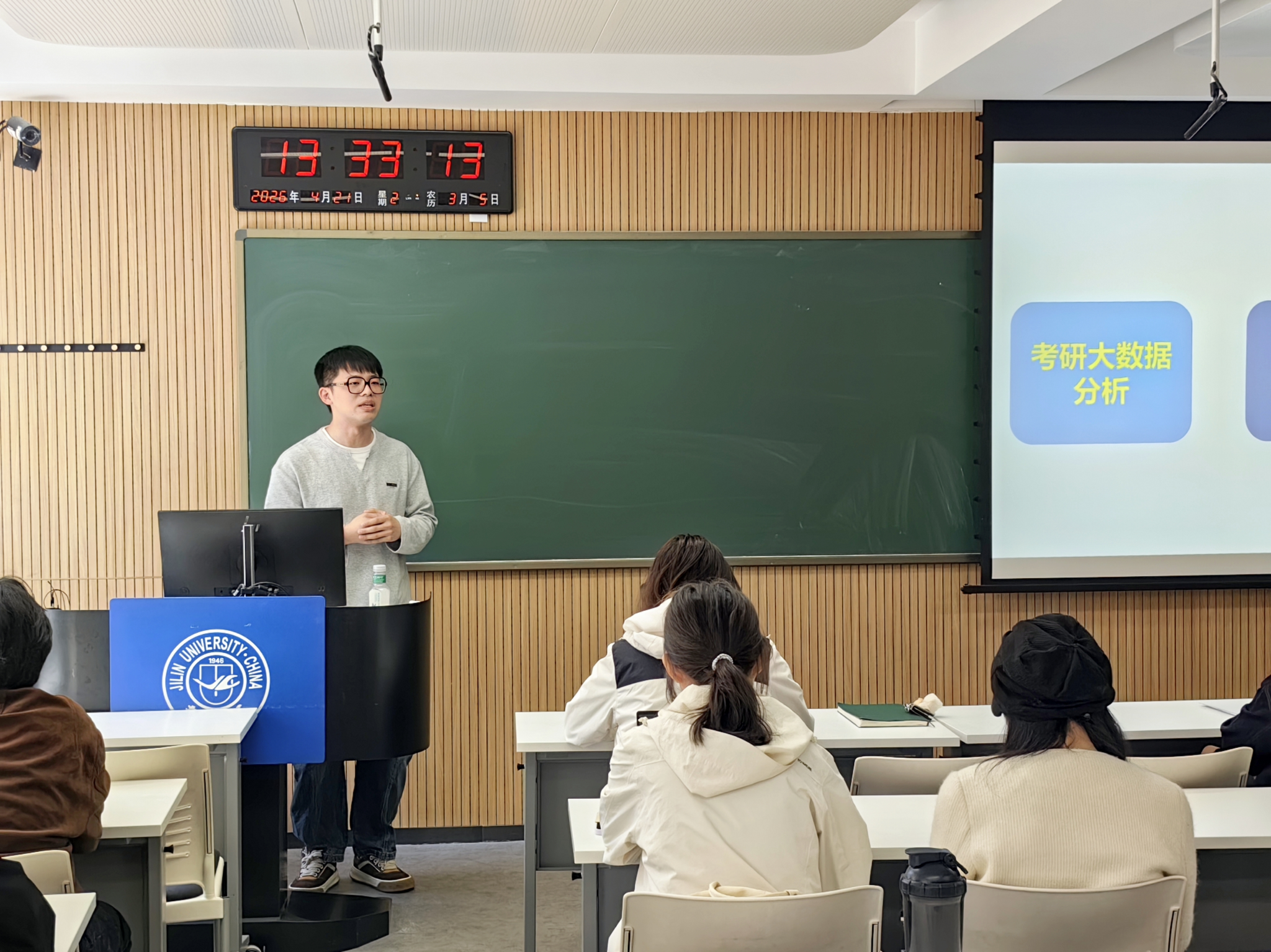 活动伊始,宋佳峻老师率先带来考研英语专题分享。作为吉大法学硕士,拥有近10年考研英语教学经验的他,围绕2026考研整体形势、单词高效记忆、公共课备考技巧等核心内容展开细致讲解,为同学们梳理了清晰的备考脉络,也为大家在考研择校等方面提供了专业指引,帮助同学们夯实逐梦基础。