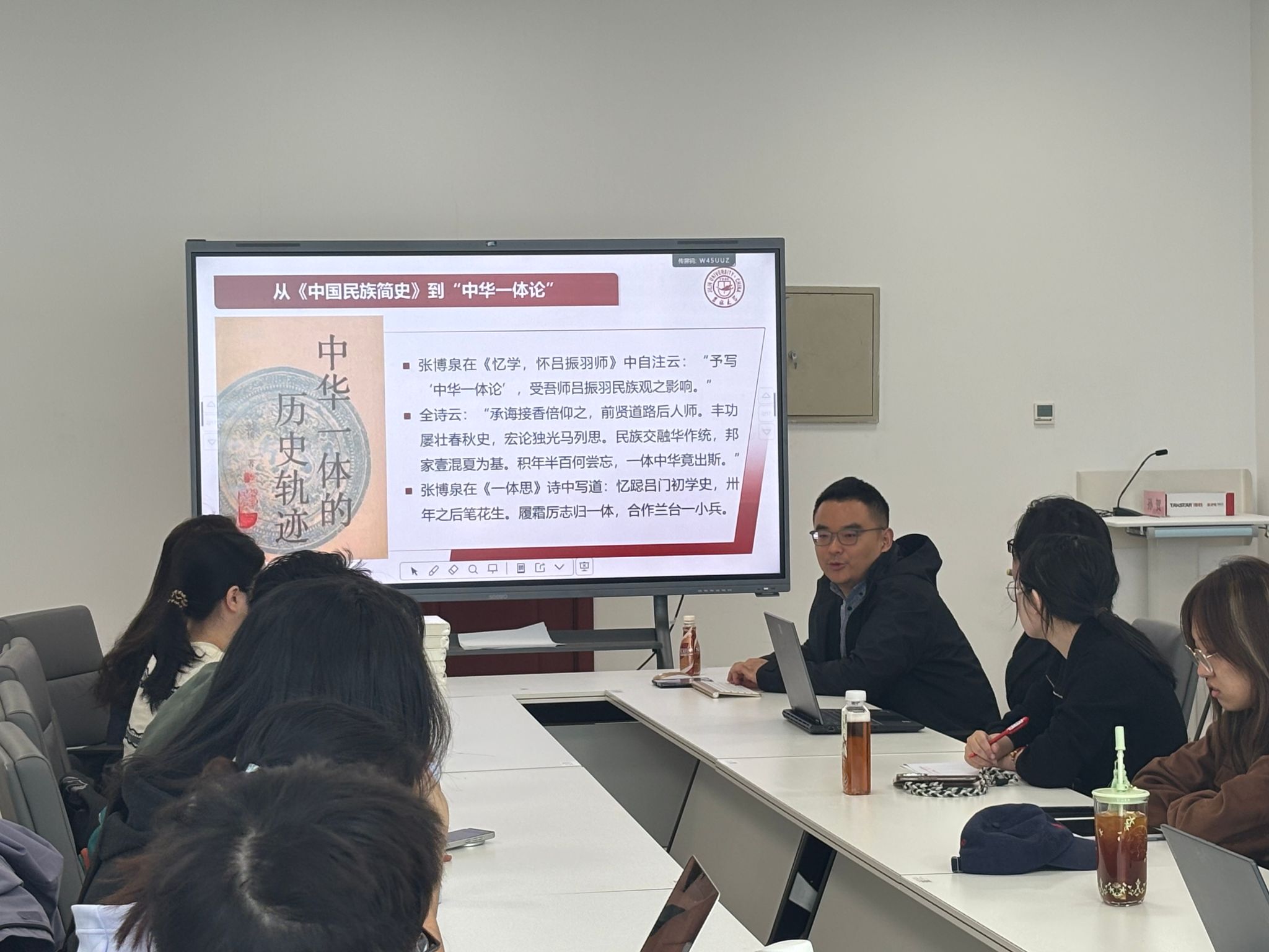 随后,徐钲洋同学围绕“中华民族发展与北方民族的关系”展开了精彩分享,并结合读书会主题,从宏观角度梳理了北方民族在中华民族形成过程中的重要作用,进一步丰富了大家对“中华一体论”的理解。自由交流环节,宁佳、段昱同、张文雅等同学积极发言,围绕民族史观、一体多元理论及其现实意义展开讨论,现场气氛活跃。