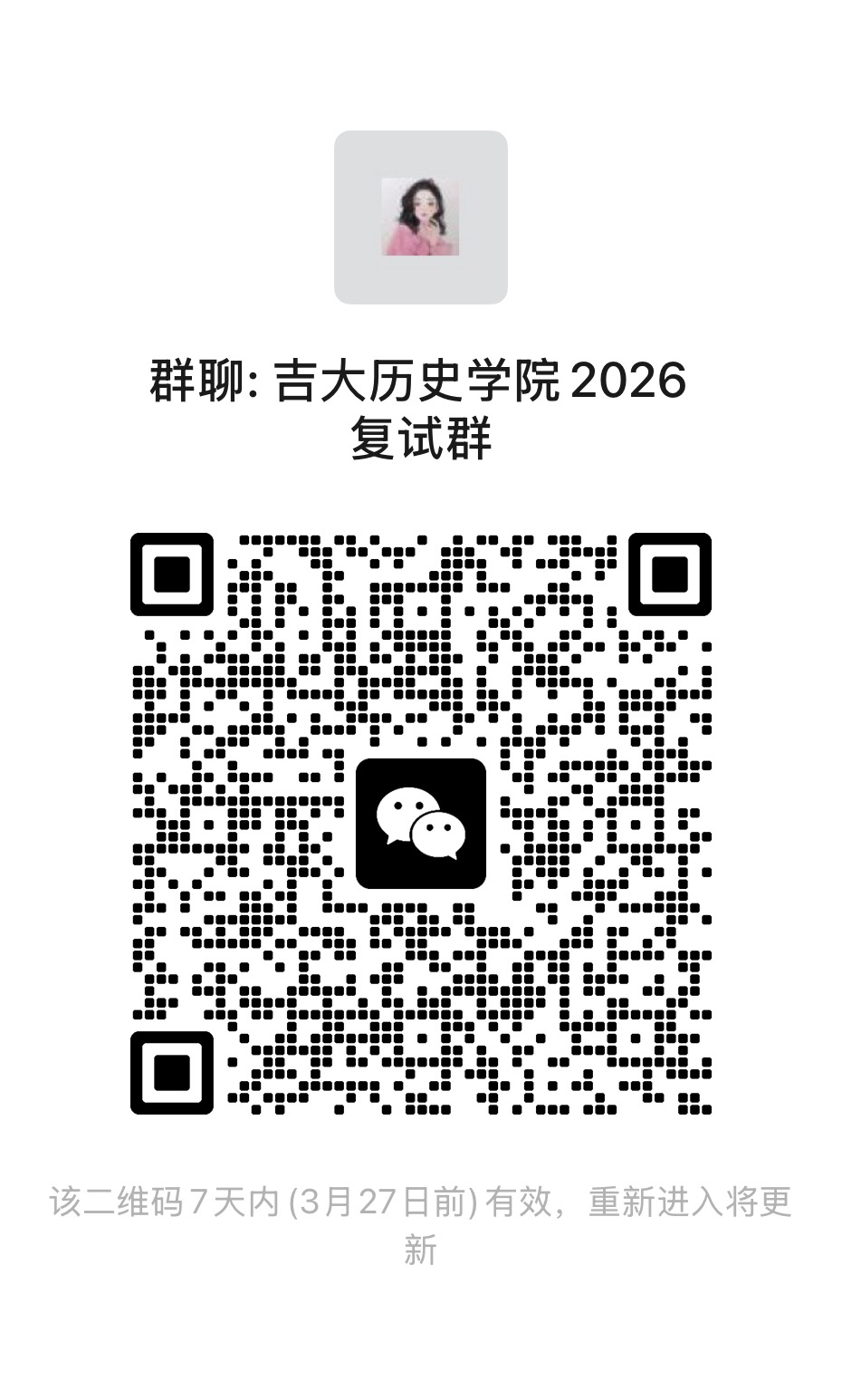 二、进入复试考生名单见附件,请扫码加入复试微信群。后续复试通知请关注吉林大学历史文化学院官方网站。“中华优秀传统文化专项”计划见后续通知。