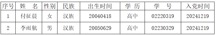 在听取党员、群众意见的基础上,经支部委员会审查,拟将付征晨、李雨航同志转为中共正式党员。根据发展党员工作有关要求,现将其有关情况进行公示。